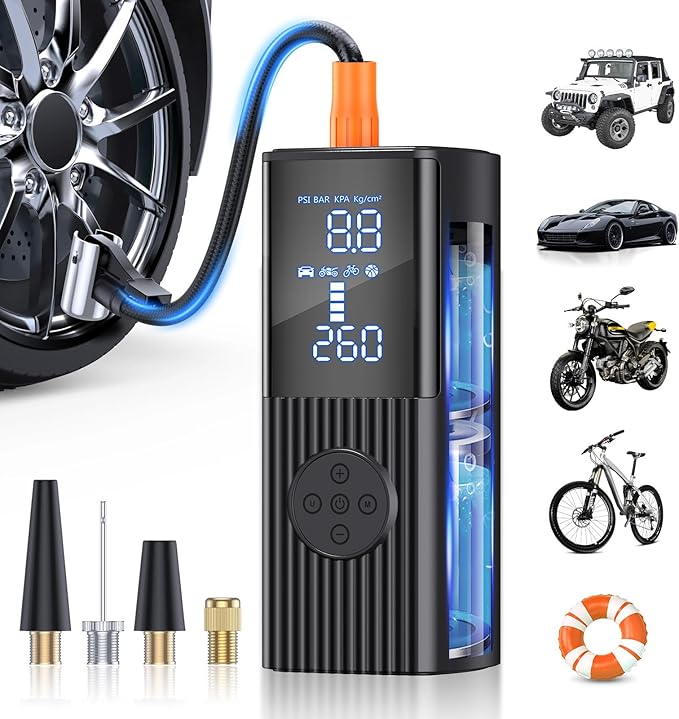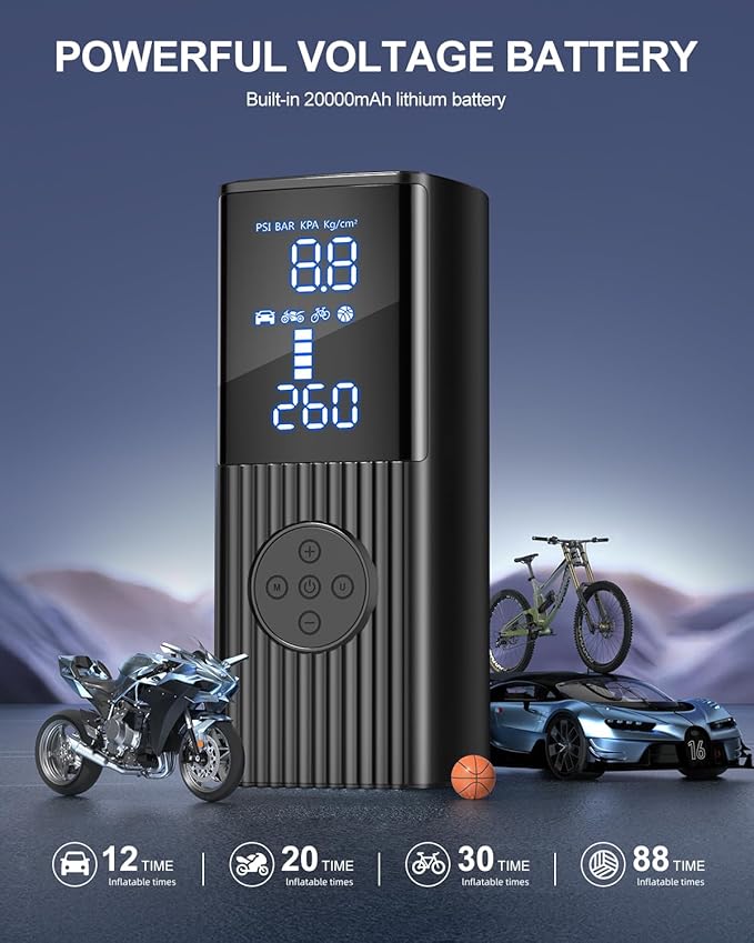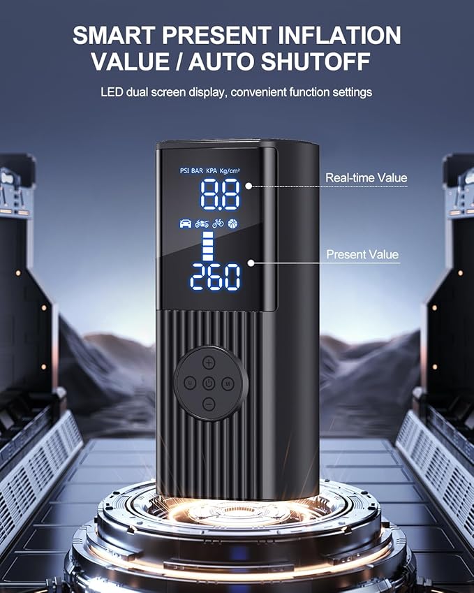 - 【4+N Smart Modes】The air compressor offers four types of pressure measurement units: PSI, KPA, BAR, and kg/cm². It also provides four preset inflation modes: bicycle, motorcycle, car, and ball. The fifth manual mode allows you to customize the pressure value according to the specific inflation target. It is extremely convenient for both daily life and travel needs