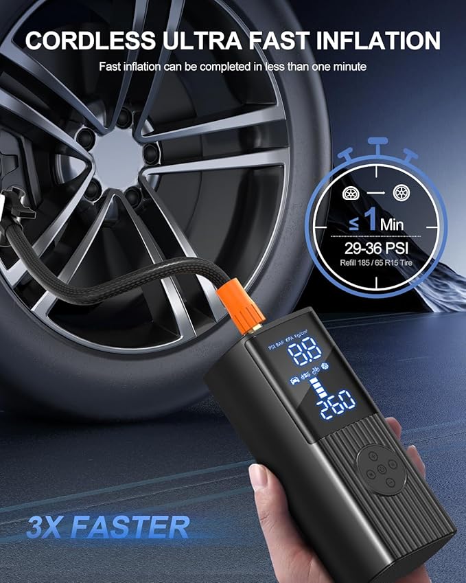 - 【Quick and Efficient Inflation】The portable air compressor features a high-performance chip, generating a powerful high-velocity airflow. Its inflation rate reaches an impressive 36L/min, twice as fast as that of regular tire inflators. This enables you to complete the inflation process in a short time, with a maximum pressure of 180 PSI