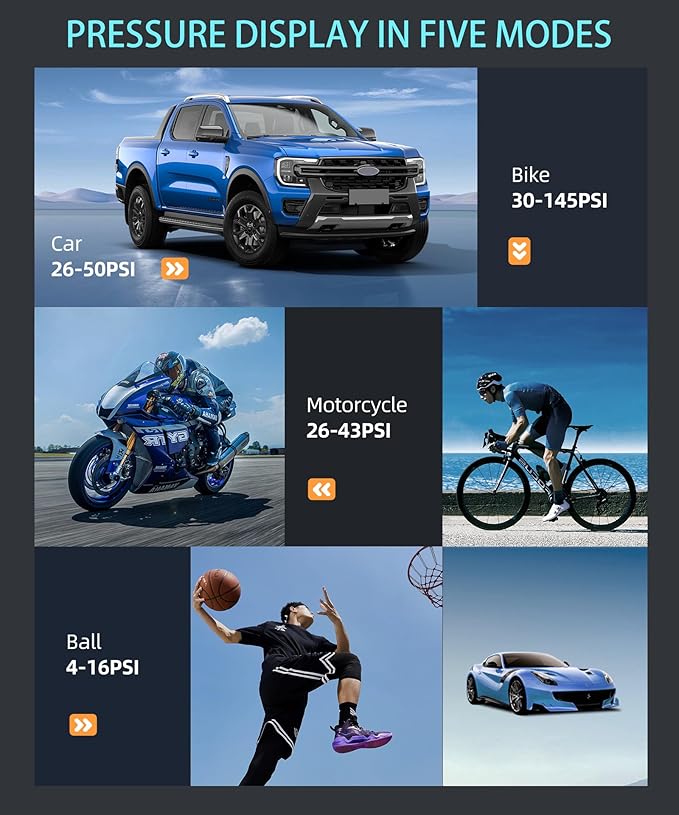 - 4+N highly adaptable mode: The portable air pump offers 4 pressure measurement units: PSI, KPA, BAR, and kg/cm². Pre-set 4 inflation modes for cars, bicycles, balls, and motorcycles. Also equipped with a manual mode for users to adjust the values themselves. It can be useful both in daily life and when going out