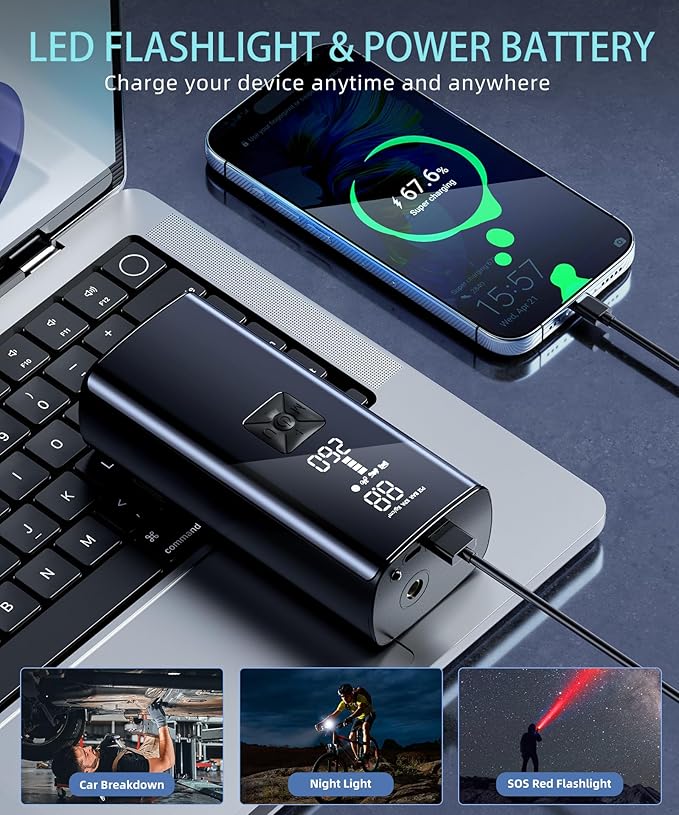- Multiple functions tool: The tire inflator equipped with 25000 mAh large-capacity battery and USB-C input port/ USB-A output port can charge mobile phones or other digital devices, no worries about running out of power when going out. LED lights can be used as a flashlight, providing convenience in dark environment