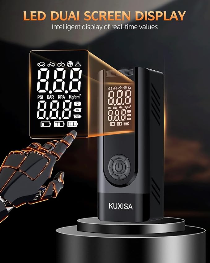 - 【Dual Screen Display】This tire inflator has a high-performance smart pump core, capable of delivering a maximum rated pressure of 180PSI (with an accuracy of ±1 PSI). It also features a dual digital LCD display that shows real-time pressure and preset values at the same time, making it easy to read and monitor tire pressure status. When the preset pressure is reached, it automatically stops to prevent over-inflation, ensuring a safe and reliable user experience