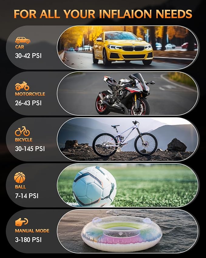 - 【4+N Intelligent Modes】Our portable air compressor caters to all your inflation requirements. It features a dual display screen, allowing for easy reading of both the preset tire pressure value and the real-time pressure. It also offers 4 preset inflation modes: bicycle, motorcycle, car, and ball, while the manual mode enables you to set the pressure value (ranging from 3 to 180psi) based on the object being inflated