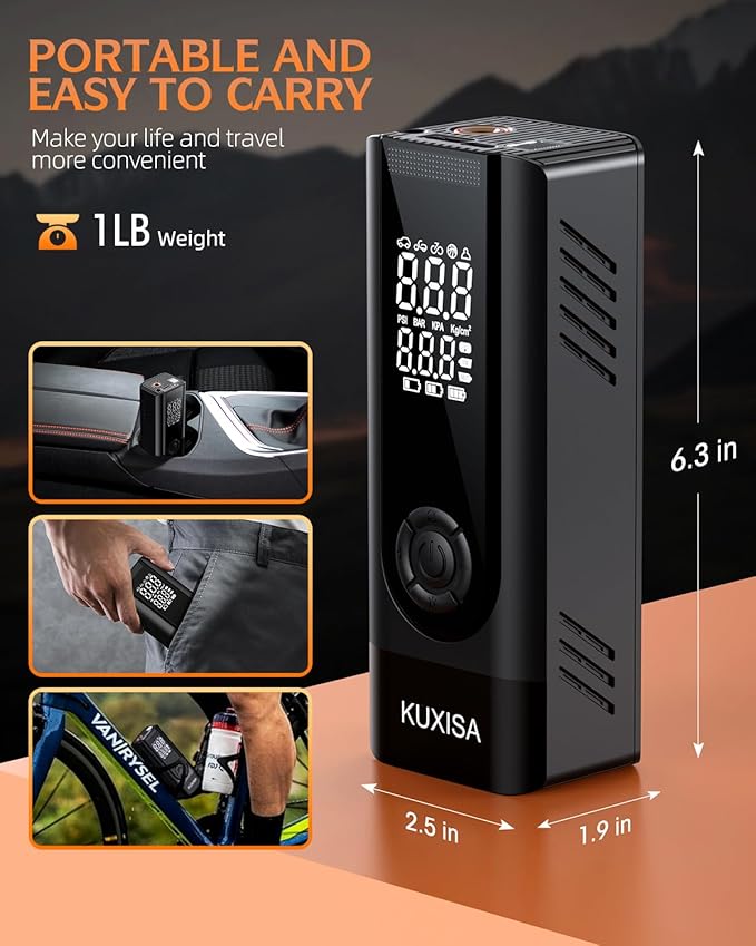 - 【Multifunctional Integration】It serves as an excellent option for inflating car, motorcycle, and bicycle tires, as well as balls and other inflatable items, boasting a range of practical functions.It is not only a portable tire inflator and air compressor, but also functions as your emergency power supply. It is equipped with high-brightness LED lights to illuminate your way during nighttime travel