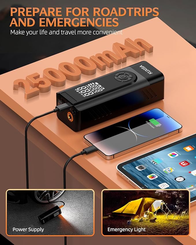 - 【Long Lasting Battery Life】Equipped with a built-in 25000mAh battery, this air compressor requires no external power source during use. What’s more, it can be charged through the car's cigarette lighter port, which avoids the situation where the inflator runs out of battery. In terms of performance, its inflation speed is three times faster than that of other regular cordless inflators on the market, and its power has also been increased by 35%