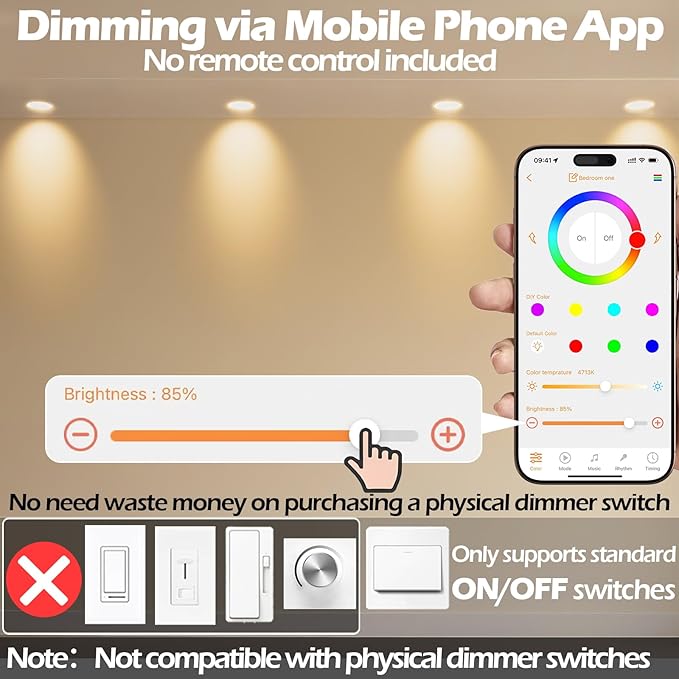 - 【Colorful Choices and DIY Color Mixing】 The Bluetooth smart downlight provides dozens of preset color schemes, users can accurately mix the light color through the color palette sliding to achieve personalized lighting design (APP control Not include the remote control; Not support dimmer;Compatible with Alexa only Not compatible with Google hone and Home pod)