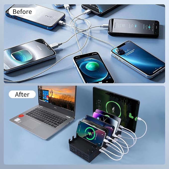 - 🔧【Sturdy One-Piece Iron Design】Built to Last with Heavy-Duty Iron Construction - Unlike flimsy plastic charging stations, our multi-port charger features durable iron slots for long-lasting strength. The wide, case-friendly slots fit phones and tablets of all sizes—even with thick cases. Keep your desk, countertop, or nightstand clutter-free and stylish