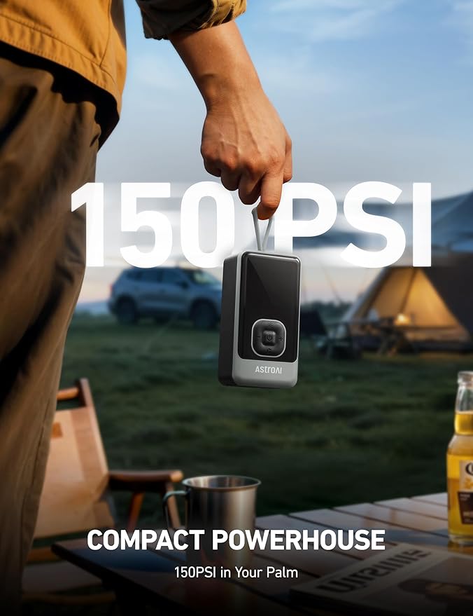 AstroAI L7 Air Tire Inflator Portable Air Compressor, 150PSI Electric Cordless Pump with Fast 1-min Inflation, Auto Shutoff, LED Light – Rechargeable for Car, SUV, Motorcycle, Bike Tires (Grey)
