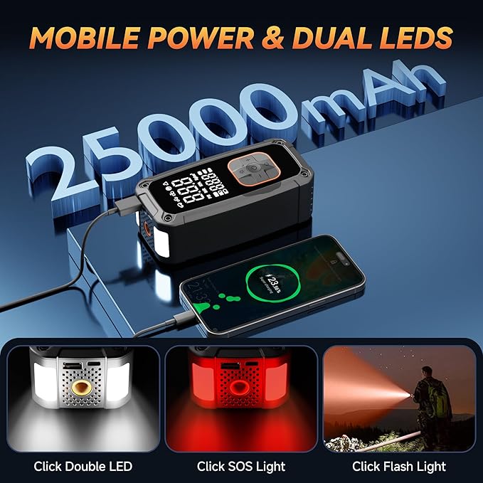 - Tire inflator: Integrated with a high-accuracy pressure gauge, the electric air pump displays real-time pressure within ±1 PSI. Equipped with dual LEDs for enhanced illumination and 3 lighting modes: steady, SOS, and strobe. Air Compressor also has USB-C and USB-A ports, allowing it to serve as a mobile power bank