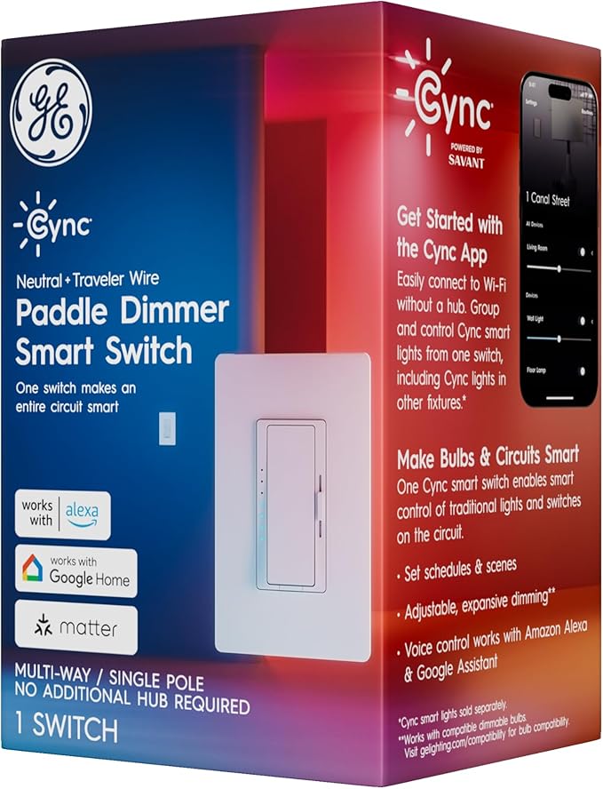 GE Cync Paddle Dimmer Smart Switch, Highly Customizable Dimmer Switch, Works with Alexa and Google Home, Matter Compatible, Easy to Install Smart Light Switch (1 Pack)