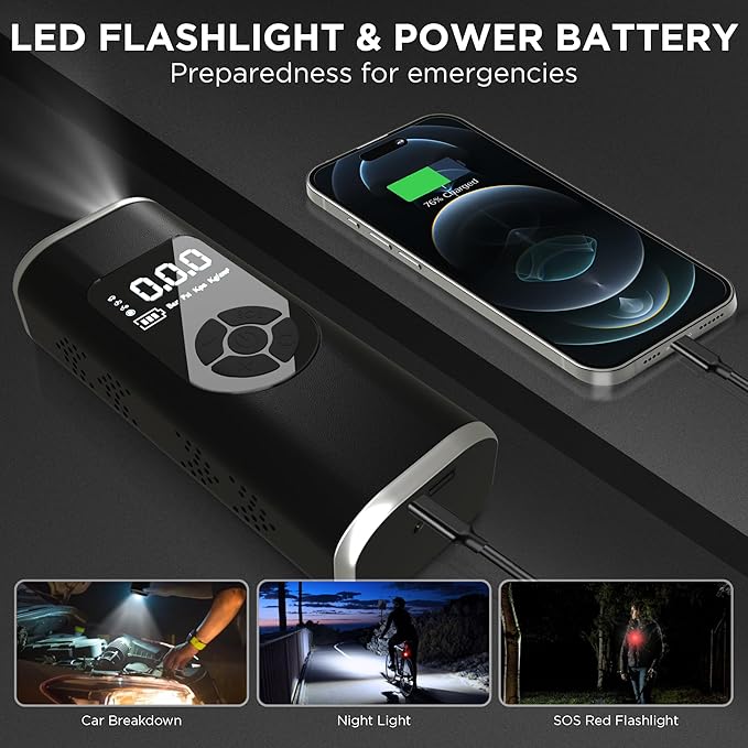 - 【Built-In LED Light & Multi-Purpose Use】 Designed with an integrated LED flashlight, this inflator provides illumination for nighttime emergencies, tire changes, or low-light conditions. The package includes multiple nozzle attachments, making it ideal for inflating car tires, bike tires, motorcycle tires, sports balls, and more.