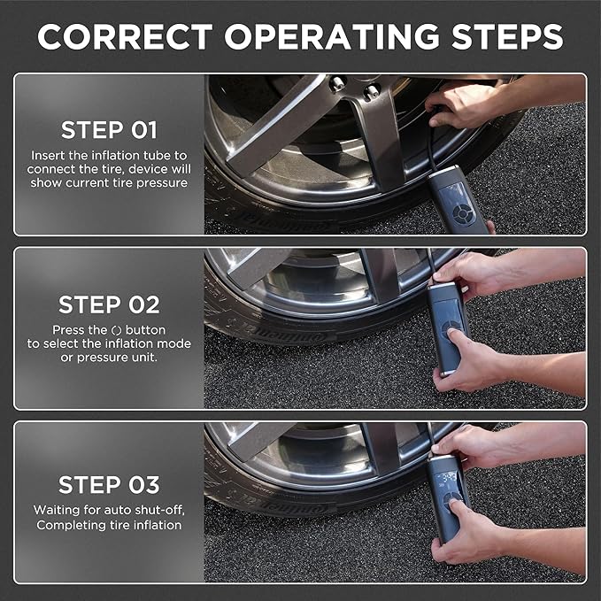 - 【Long-Lasting Battery with Fast Charging】 Built with a 6000mAh rechargeable battery, this tire inflator provides up to 30 minutes of continuous use on a full charge. The Type-C fast charging technology fully recharges the device in just 2-3 hours, making it ready for emergencies or daily use.