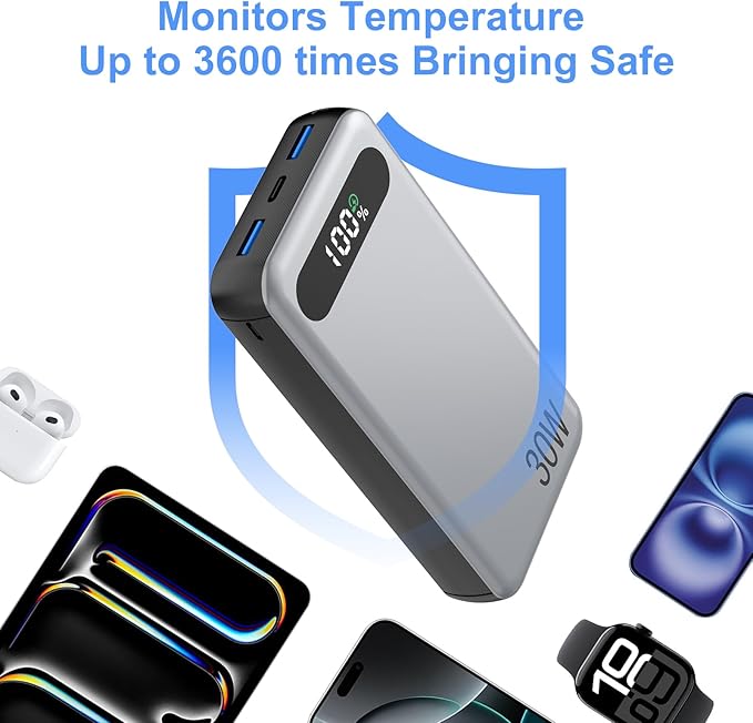 - [Powerful and Compact]: The 20000mAh portable power bank is equipped with a high-quality lithium polymer battery that is powerful and compact, providing up to 4 full charges for the iPhone 15 and 3 charges for the Samsung S24, making it an ideal choice for travel