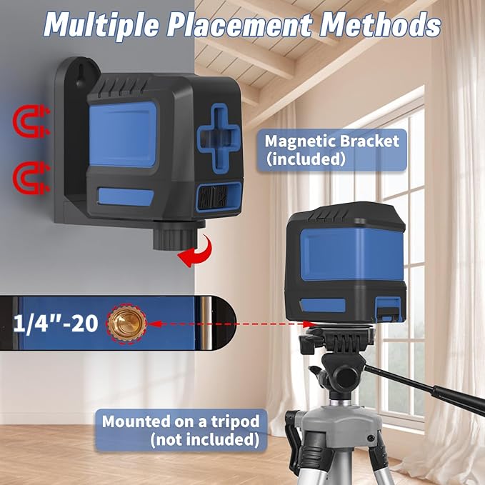 - User-Friendly Design: The laser level is designed to be simple to use. Just slide the pendulum to the unlocked position, and the tool instantly projects a perfectly straight laser cross onto any surface. The sliding switch makes it ideal for users with no prior DIY experience, allowing anyone to operate it with ease. Our Laser Level line tool can be mounted to most metal surfaces with the magnetic retainer (included) or mounted on a tripod (not included)