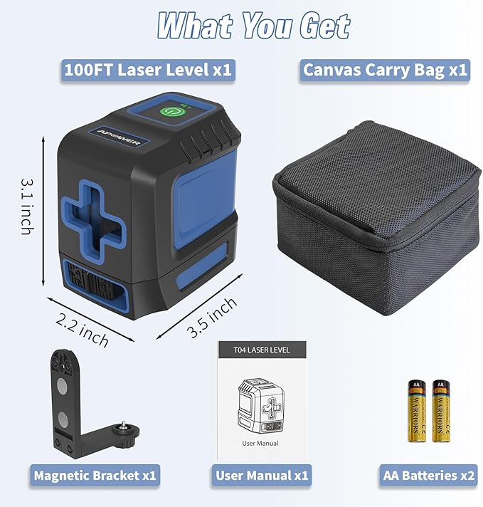 - What You Get: 1x 100FT Laser Level, 1x Magnetic Bracket, 2x AA Batteries, 1x Canvas Carry Bag, 1x User Manual. We stand behind our products and provide 24-hour customer service. If you have any question or issue on our products, and we promise a nice solution to you. Thanks