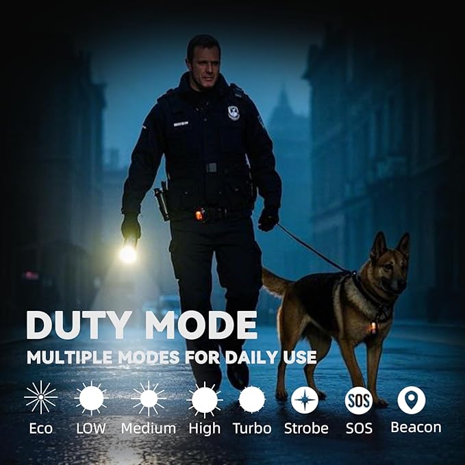 - PROGRAMMABLE MODES: Choose between tactical mode and duty mode to suit different situations. In tactical mode, you can quickly activate strobe and turbo modes for emergencies. In duty mode, more modes for daily use can be selected.