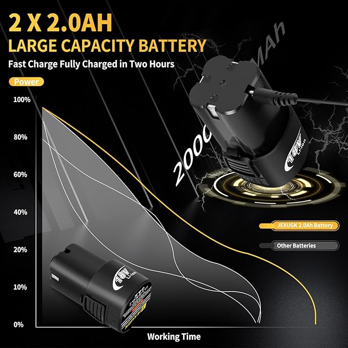 - 2x2.0Ah High Capacity Li-Ion Battery - JEXUGK battery drill is equipped with 18V 2.0Ah Li-Ion battery, which can assist the taladro's peak torque up to 400IN-LSB, and the JEXUGK battery charging and discharging cycle has made significant progress to ensure that each battery is safe and reliable, and the overall endurance has been qualitatively improved