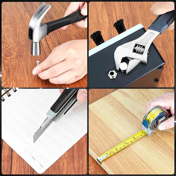 - 120 Pcs Drill Set - JEXUGK herramientas kit includes: 18V cordless drill, ram's horn hammer, precision screwdriver, one-piece screwdriver, pointy wide mouth pliers, wrenches, saws, stylus, sockets, tape measure, utility knife, impact drill, twist drill, extension pole drill bit, screws and extension screws and more, you will get a box of tool kit for all your home needs