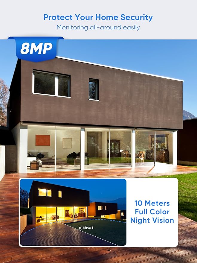 - 【IP66 Water-proof Outdoor Camera with Night Vision】Built with IP66 water-proof, the ruggedized all-metal camera can be used in any harsh weather conditions and brave extreme high-low temperatures(-20℃-60℃). Up to 98ft IR night vision and 33ft full-color night vision, provide you 24/7 security coverage.