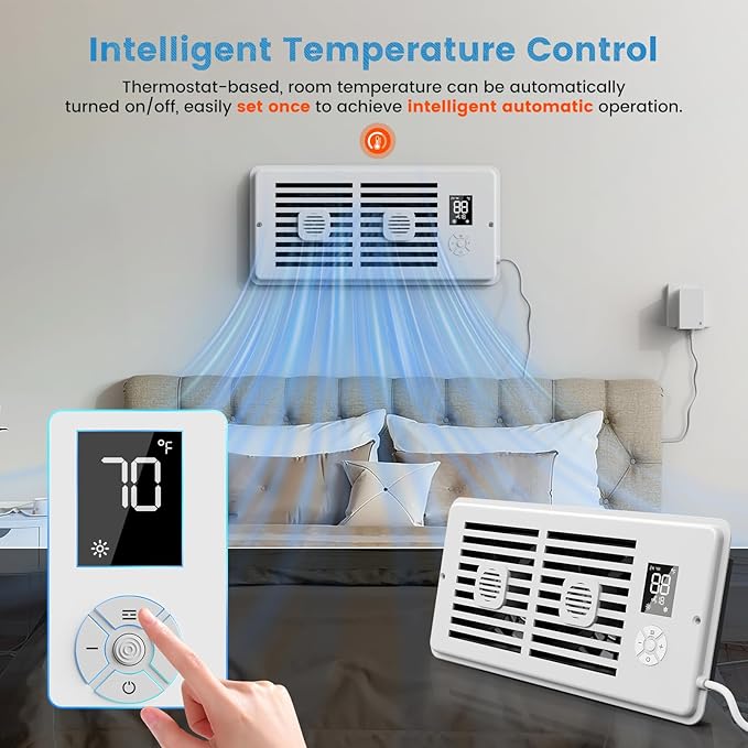 - 【Smart Temperature Control】Powerful fan system designed to improve airflow in wall and floor vents of HVAC systems. This booster fan is equipped with a high-precision temperature sensor and upgraded thermostat, 10 adjustable speed settings. The fan will automatically start and stop according to the target temperature you set, bringing more cool or warm air into the room, and speeding up airflow to improve the efficiency of your air conditioning or heating system, improving home comfort.