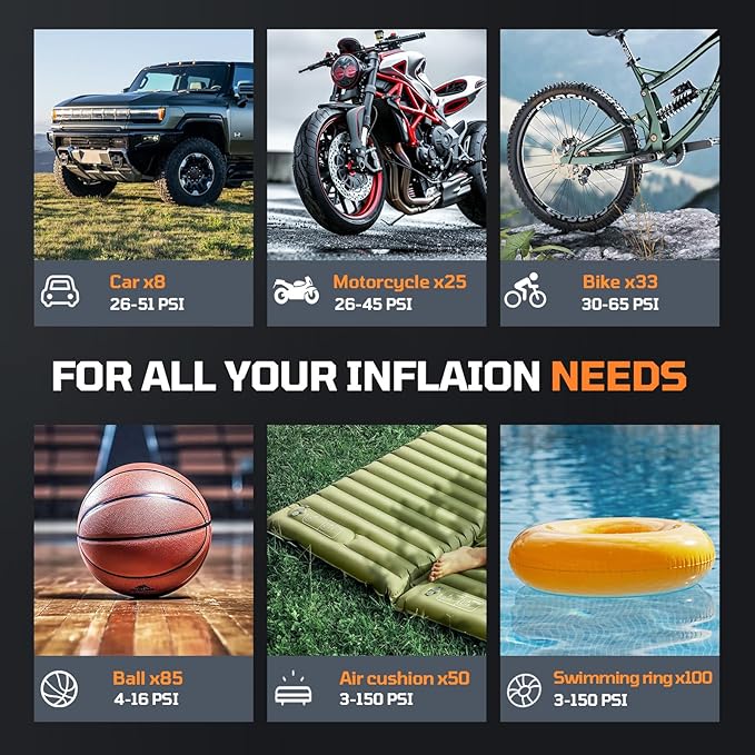 - 【Fast and Safe Inflation】Equipped with an intelligent sensing system, when the tire pressure reaches the preset value, it automatically stops inflating. The safety factor is maximized! The inflation rate soars to 36L/min, five times faster than normal tire inflator portable air compressors, allowing you to complete inflation in a short time.On a single charge, it can inflate 5x car tires (27-35 PSI) or 10x motorcycle tires, ensuring you never face tire pressure run out