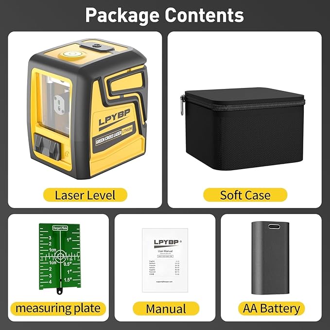 - 【Practical Design and Package Contents】Compact and portable, with IP54 waterproof/dustproof/shockproof design, this product offers practical working conditions. 1*Laser level instrument kit,1*Laser level,1*Laser level support,1*A light measuring plate,1*Charging Head,1*Lithium batteries,1*Charging cable