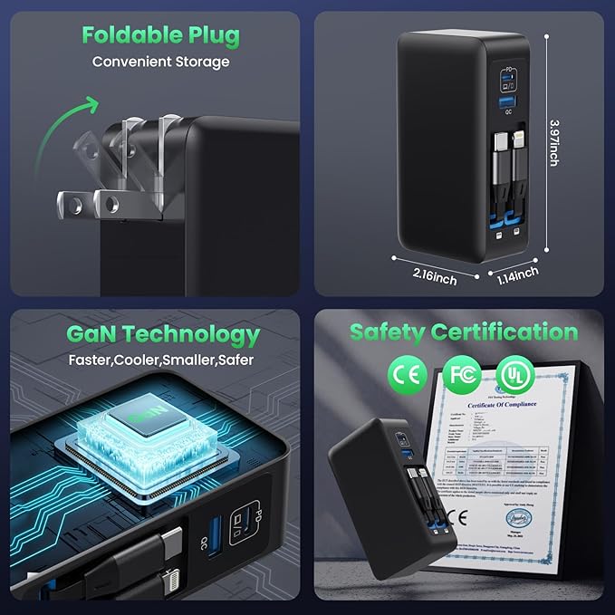 - Special Feature : 120W USB C Charger Block with 2 Built-in Retractable Cables,4-in-1 GaN IV Foldable Plug Wall Charger Fast Charging Station,PD 65W Laptop Adapter for Macbook/iPad,iPhone 16/15/14,Galaxy S24,Android etc 120W USB C Charger Block with 2 Built-in Retractable Cables,4-in-1 GaN IV Foldable Plug Wall Charger Fast Charging Station,PD 65W Laptop Adapter for Macbook/iPad,iPhone 16/15/14,Galaxy S24,Android etc