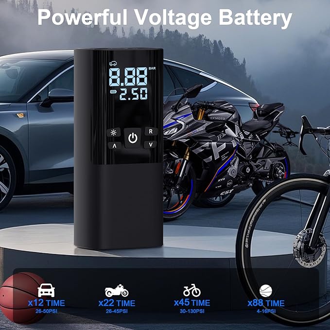 - COMPACT PORTABLE DESIGN: This portable air compressor weighs only 1 lb, dual power supply modes, multiple nozzle adapters can be used to inflate tires, swim rings, small airbags and so on. It comes with a storage bag for easy storage in your car, bike rack, or backpack, great for home use and outdoor travel, perfect gift for men or women.