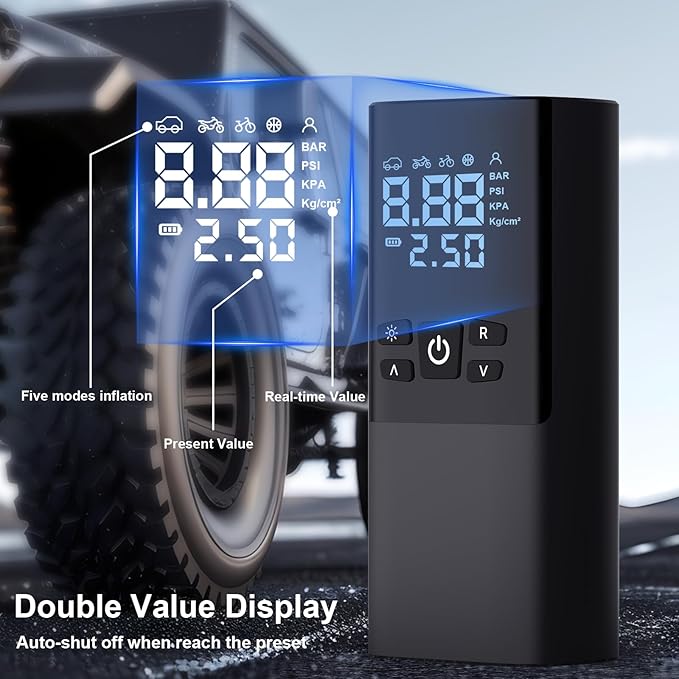 - SMART AUTO-PAUSE FUNCTION: Advanced sensor technology accurately collects pressure data at all times while the tire is inflating and pauses as soon as it reaches your preset pressure, safe and efficient, and an ideal tool for you as a tire pressure gauge for your car.