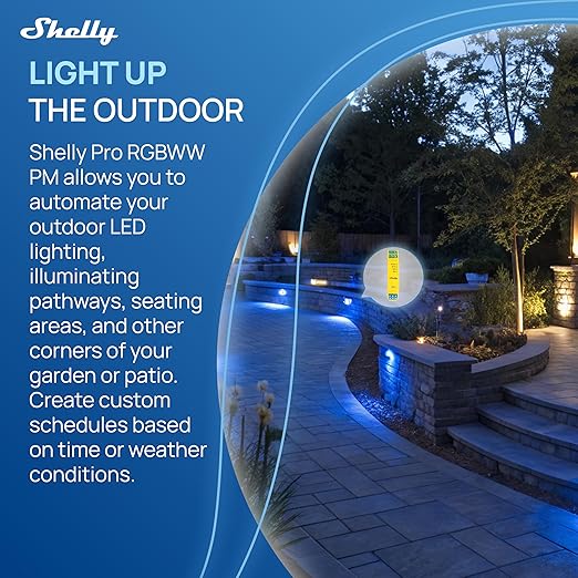 - The Shelly Pro RGBWW PM is a smart Wi-Fi and LAN-connected LED controller designed for RGB, RGBW, and CCT LED strips. It features five independent channels, supporting up to 24 VDC and 6 A per channel (16 A total), with built-in power metering for energy monitoring. Housed in a professional DIN-rail form factor, it offers flexible compatibility with buttons, switches, and analog controls, making it easy to integrate into both residential and commercial lighting setups.