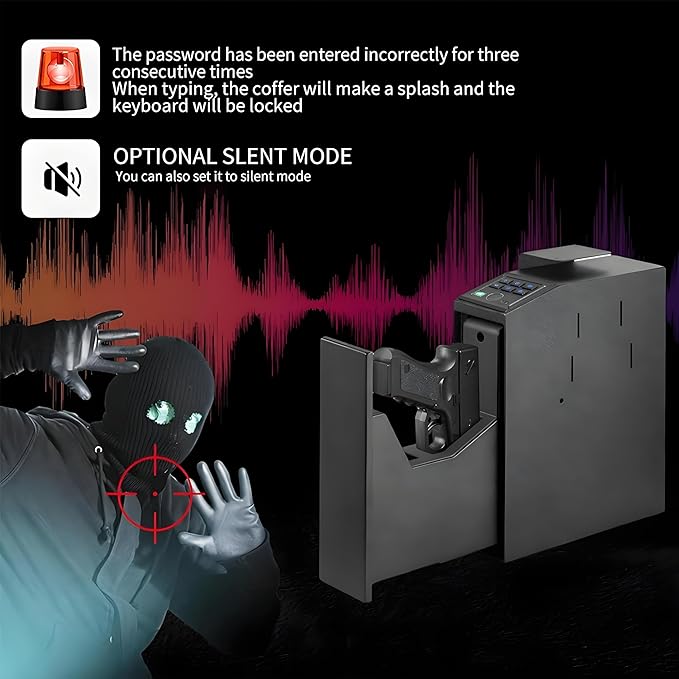 - ✅Fits Most Handguns & Spare Magazine: This gun safe is designed to accommodate handguns up to 9.5" in length. Its versatile mounting options allow you to secure it from the TOP, RIGHT, or LEFT side, or simply place it directly on the floor. Perfect for discreet storage under a desk, nightstand, bookshelf, wall, or even in your vehicle.