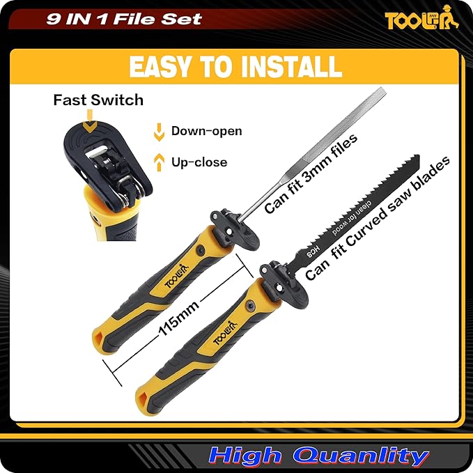- 【Clever Design】 Lockback mechanism secures files & saw blades in place firmly, Through the ingenious clamping design, needle files and small blades can be supported, so we provide 6 pcs different files & 2 pcs saw blades for use to meet different use needs.