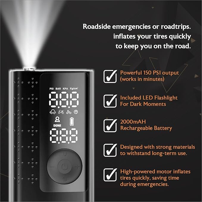 Portable Air Compressor Tire Inflator Pump – Cordless Electric 5X Faster Air Pump for Car, Bike, Ball & More – 150 PSI with Pressure Gauge, Battery Powered, Auto-Off, Accessories Included