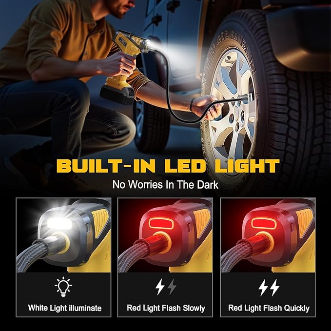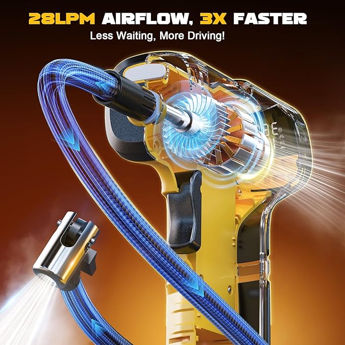 - ULTRA-FAST INFLATION & 150PSI MAX PRESSURE: Equipped with a 21mm metal cylinder and high-performance motor, this battery air compressor for dewalt delivers 28L/min airflow, inflating a 195/65/R15 tire in just 5 minutesmins. Includes 5 specialized nozzles for cars, motorcycles, bicycles, sports balls, inflatable toys, and more.
