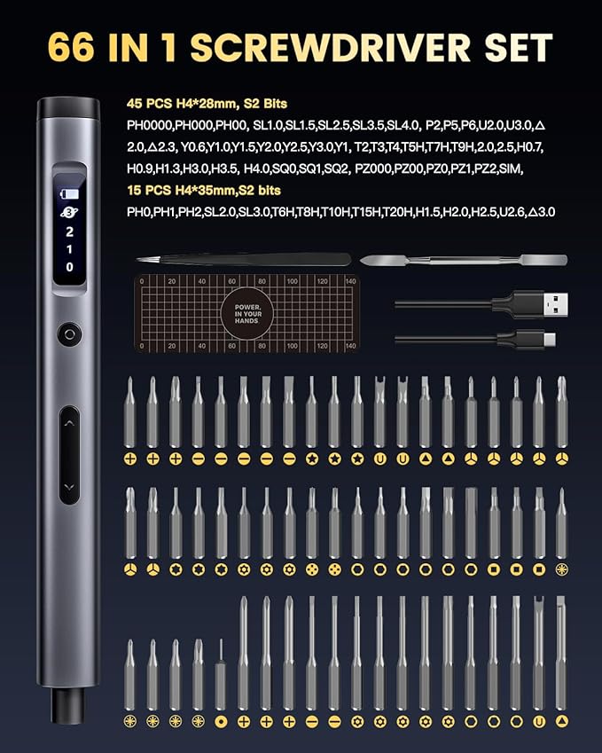 - 🧲🧲Magnetic Storage and Accessories: The mini screwdriver set electric includes a durable magnetic storage case for organizing its components, ensuring no parts are misplaced. This precision desarmadores set is equipped with 60 high-quality bits and accessories, tailored for a range of DIY and repair tasks.