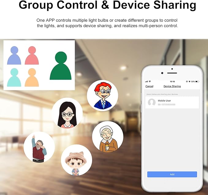 - 【Effortless Group Management】Control multiple bulbs from a single app, effortlessly managing your lighting. Create custom groups for specific areas of your home or settings, sharing devices with family members for synchronized control. Enjoy the flexibility of multi-person control and make every room in harmony with just a few taps.
