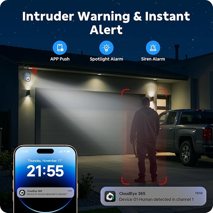 - Human Detect & Alarm: Compared with traditional motion detection, this cctv camera security system adopts 2025 advanced AI technology, which can effectively distinguish people from animals or objects and reduce false alarms. When there is intruder enters the surveillance area, a bright light or siren will be emitted for warning, and a APP message will be pushed to you