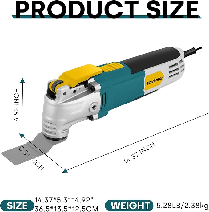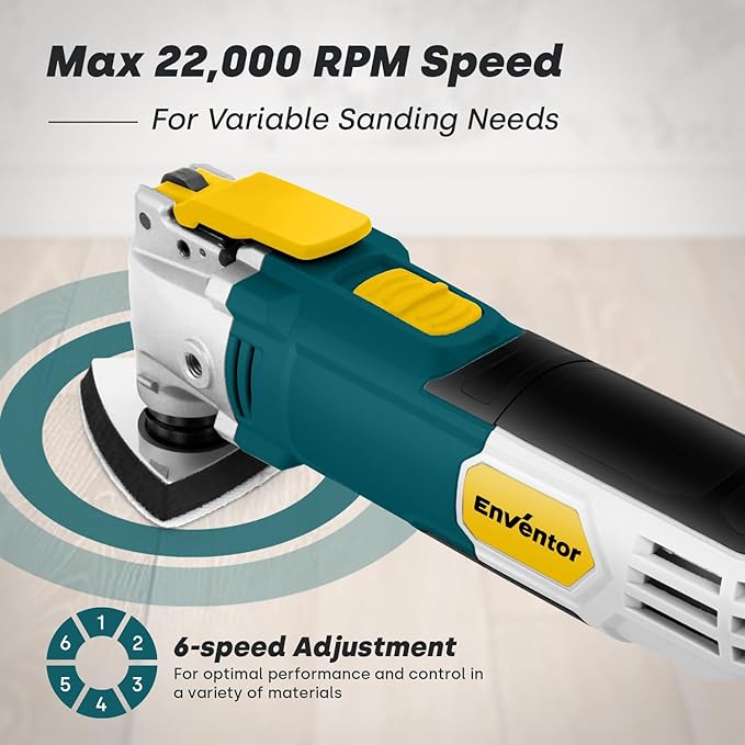 - 6 Variable Speeds and 3° Swing Angle: Enventor multi tool saw offers 6 variable speeds between 15,000-22,000 OPM. Use high speed for sawing, sanding, and polishing stone, and low speed for cutting metal and polishing smooth surfaces. 3⁰ Swing angle design makes work more efficient.