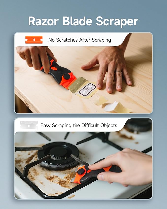 - 2 IN 1 RAZOR BLADE SCRAPER: This scraper tool is equipped with both plastic and metal blades to meet your various needs. The plastic blade is suitable for delicate surfaces without scratching surfaces. The metal blade is perfect for some rough, hard surfaces