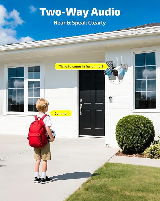 - 《Two-Way Talk Anytime》This solar security cameras wireless outdoor come with a built-in microphone and speaker, allowing you to hear and speak through your phone. Easily greet visitors, talk to family, or warn unwanted guests in real time. A simple way to stay connected and make your home security camera system even smarter.