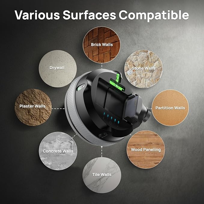- 【55,000Pa Wall Suction Laser Level Tool】- Anti-Gravity Laser Level,No Need for Tripods, Free up your hands.Ideal for picture hanging, shelf installation, cabinet mounting, wallpaper alignment, lighting setup, and DIY projects, it ensures precise positioning for home improvement, renovations, and construction tasks