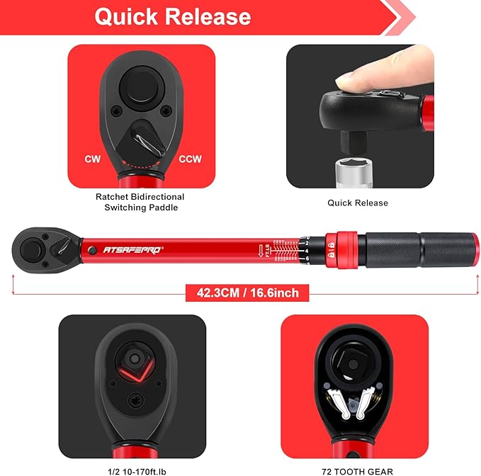- 4. Professional Design: The torque wrench has a 72-tooth quick release reversible ratchet head gives you the flexibility to apply torque in both clockwise and counterclockwise directions. Plus, the quick release feature makes it easily install and remove socket, ensuring a secure grip and preventing accidental drops