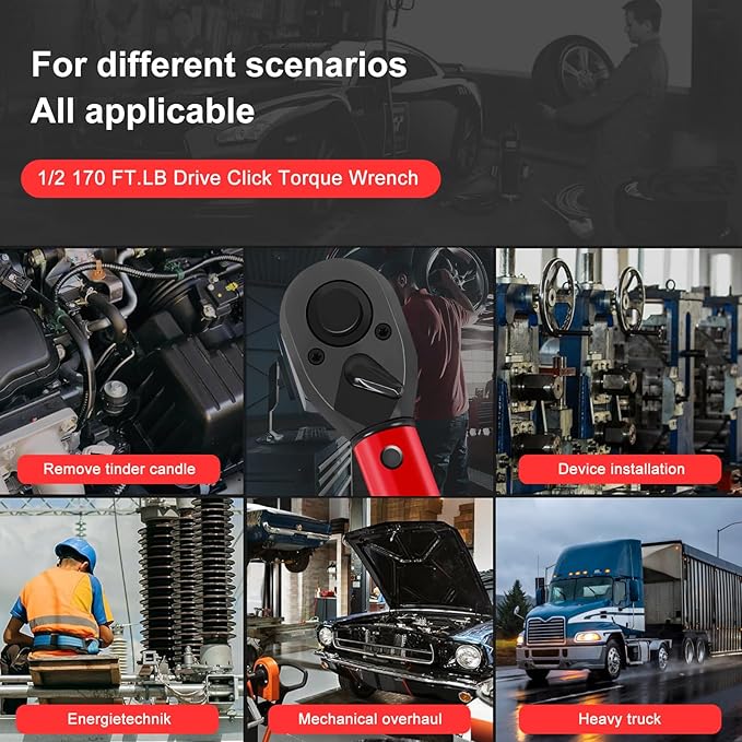 - 1.High Accuracy: The 1/2-Inch Drive Click Torque Wrench features precise dual scales of 10-170FT.LB/13.6-230.5N/M . The torque wrench 1/2 drive tests for accuracy to industry standards within ±3%. The adjustable torque wrench set is fully calibrated and tested for accuracy according to the requirements of ISO and ASME calibration certificate with every set.