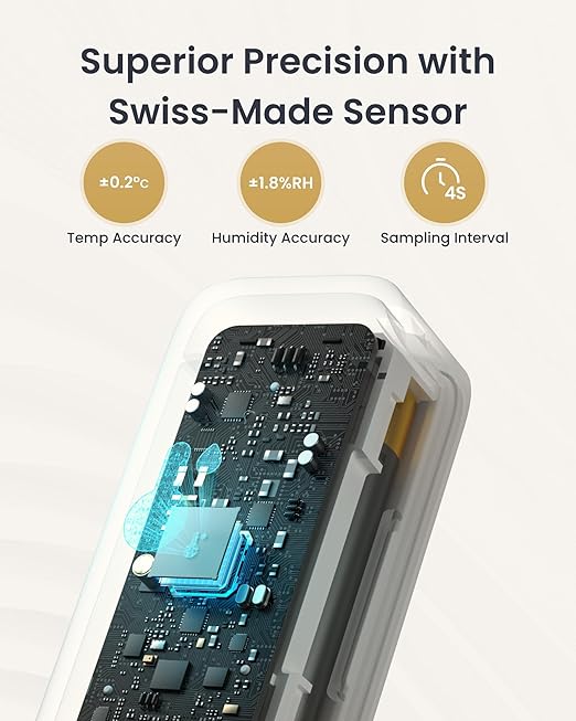 - Sensitive to Changes in Temperature & Humidity: With a built-in industrial Swiss Sensirion sensor, you can expect accuracy up to ± 1.8% RH, ± 0.2 °C/0.36 °F, with a fast and accurate 4-second sampling interval to continuously monitor the temperature and humidity in the surrounding environment.