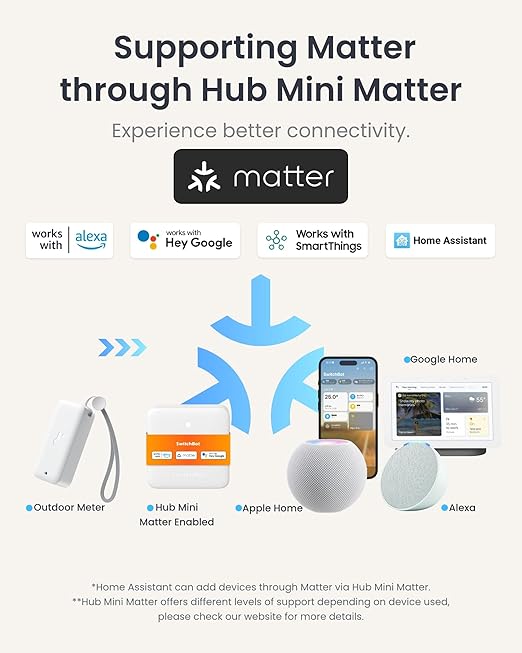 - Use Voice Commands: By using the SwitchBot Hub Mini (included), you can now use voice commands to inquire about temperature and humidity, and can also control your device remotely. Just ask Alexa - it's fast and convenient! The indoor outdoor thermometer wireless also supports Google Home, Siri Shortcuts, and SmartThings.