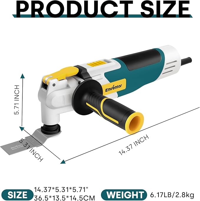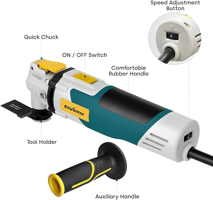 - 6 Variable Speeds and 3° Swing Angle: Enventor multi tool saw offers 6 variable speeds between 15,000-22,000 OPM. Use high speed for sawing, sanding and polishing stone, and low speed for cutting metal and polishing smooth surfaces. 3⁰ swing angle design makes work more efficient.
