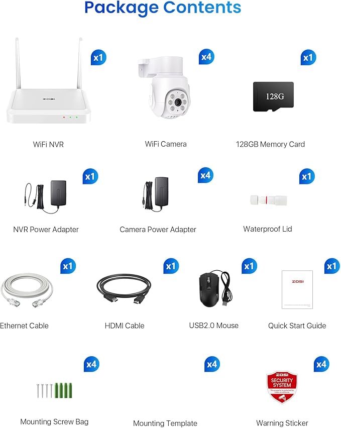 ZOSI 8 Channel 3K Wi-Fi 6 Security Camera System with 128G Memory Card for 24/7 Record, 4 x 5MP Pan Tilt WiFi Camera with Auto Tracking, Color Night Vision, Plug-in, AI Person Detect, 2-Way Audio