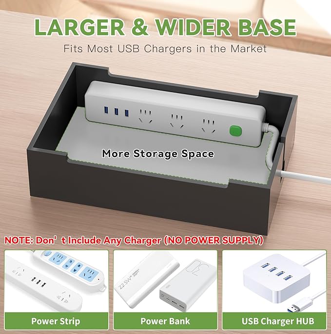- Larger and Wider Base: The dock Station have a larger and wider base (Size 28 x 15 cm) sultable for a variety of power supplies. It can easily store the power strip and hide the cables for greater safety. Four anti-slip pads on the bottom increase the stability
