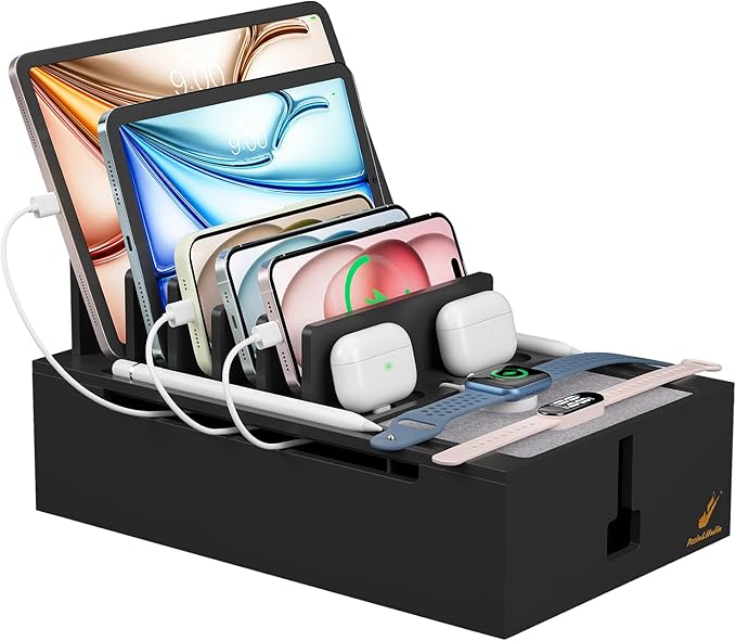 - Charging Station for Multiple Devices: Pezin & Hulin charging station is made of solid bamboo that will last for years to come.It can hold up to 8 devices, keep all your devices in one place without having to deal with cables running around everywhere. It is ideal for company, office, living room, bedroom, kitchen, hotel, restaurants and classroom (PLEASE NOTE: The charger HUB power supply and Cables is not included in the package)