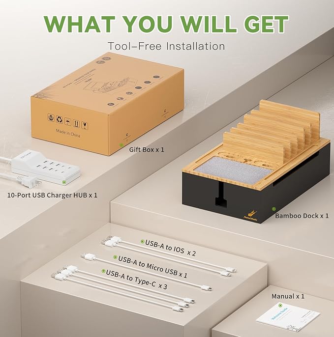 - What You Can Get: 1 x Pezin & Hulin Bamboo Charging Station, 1 x 10-Port USB Charger HUB & Cord, 6 x Short USB Cables (3pc Type-C, 2pc for lPhone & lPad, 1pc Android) for your daily use, 1 x user manual