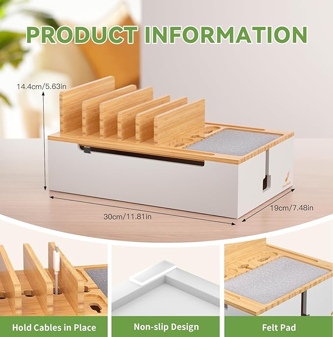 - Larger and Wider Base: The dock Station have a larger and wider base (Size 30 x 19 cm) sultable for a variety of power supplies. It can easily store the power strip and hide the cables for greater safety. Four anti-slip pads on the bottom increase the stability